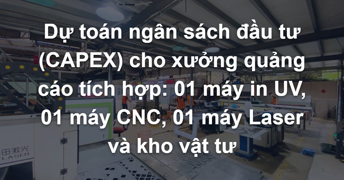 Dự toán ngân sách đầu tư (CAPEX) cho xưởng quảng cáo tích hợp: 01 máy in UV, 01 máy CNC, 01 máy Laser và kho vật tư